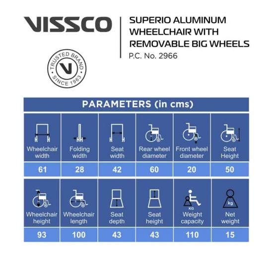 Vissco Wheelchair Wheels is made with lightweight high-grade aluminum. The entire Superio range satisfies customer needs from all ends. They come with pneumatic tyres for more comfort on any road conditions, fire retardant seat covers and Modern Wheelchair Stylish looks. This range draws its inspiration from European designs and is extremely durable Lightweight Wheelchair.